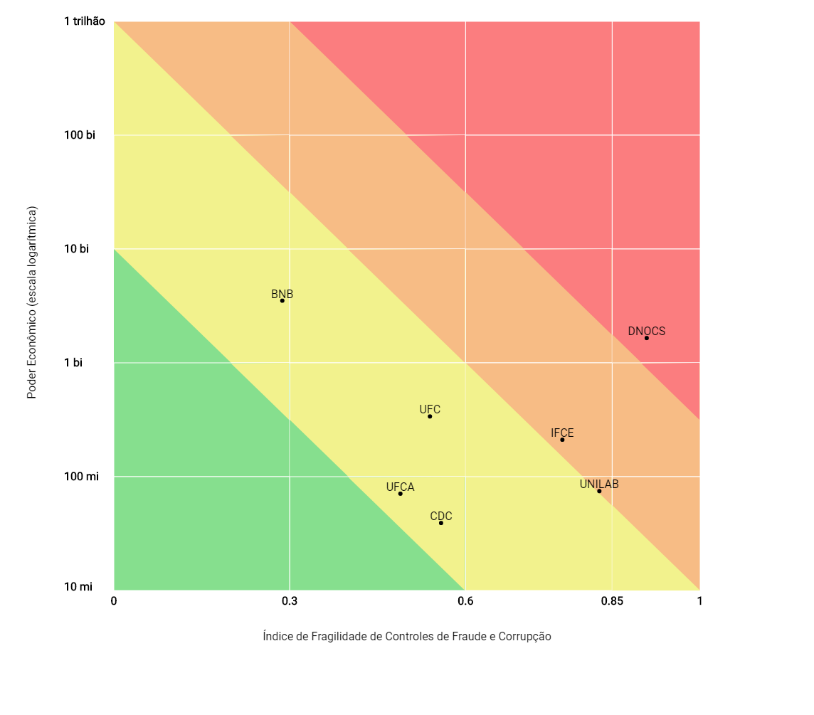 Órgão que já foi marcado por denúncias de corrupção, o BNB tem investido em ações de transparência e controle interno nos últimos anos. Bem avaliado em todos os critérios do estudo, o órgão só aparece como risco “médio” por causa do grande volume de recursos que controla, na ordem de mais de R$ 3,5 bilhões.